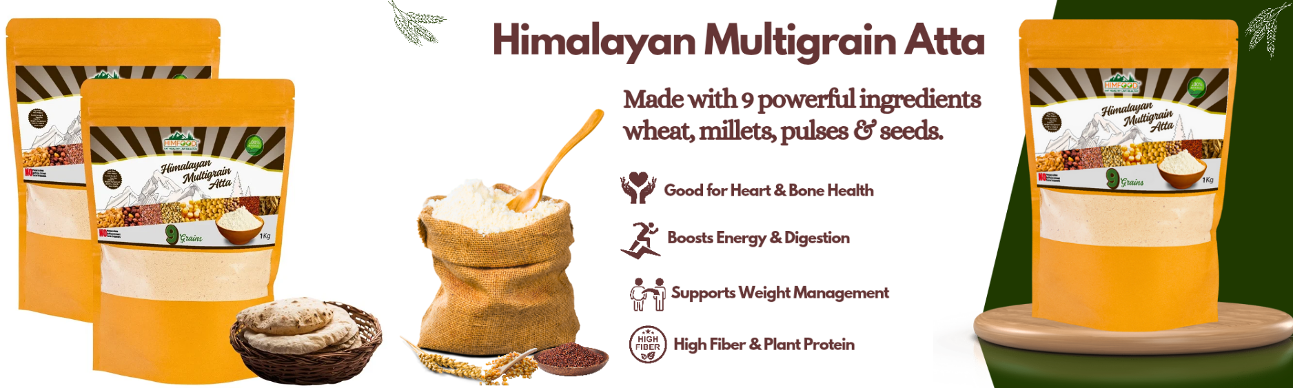 Nutritious Himalayan multigrain atta with wheat, chana, ragi, soybean, bajra, makka, jau, jowar & alsi. High fiber, preservative-free & gut-friendly.