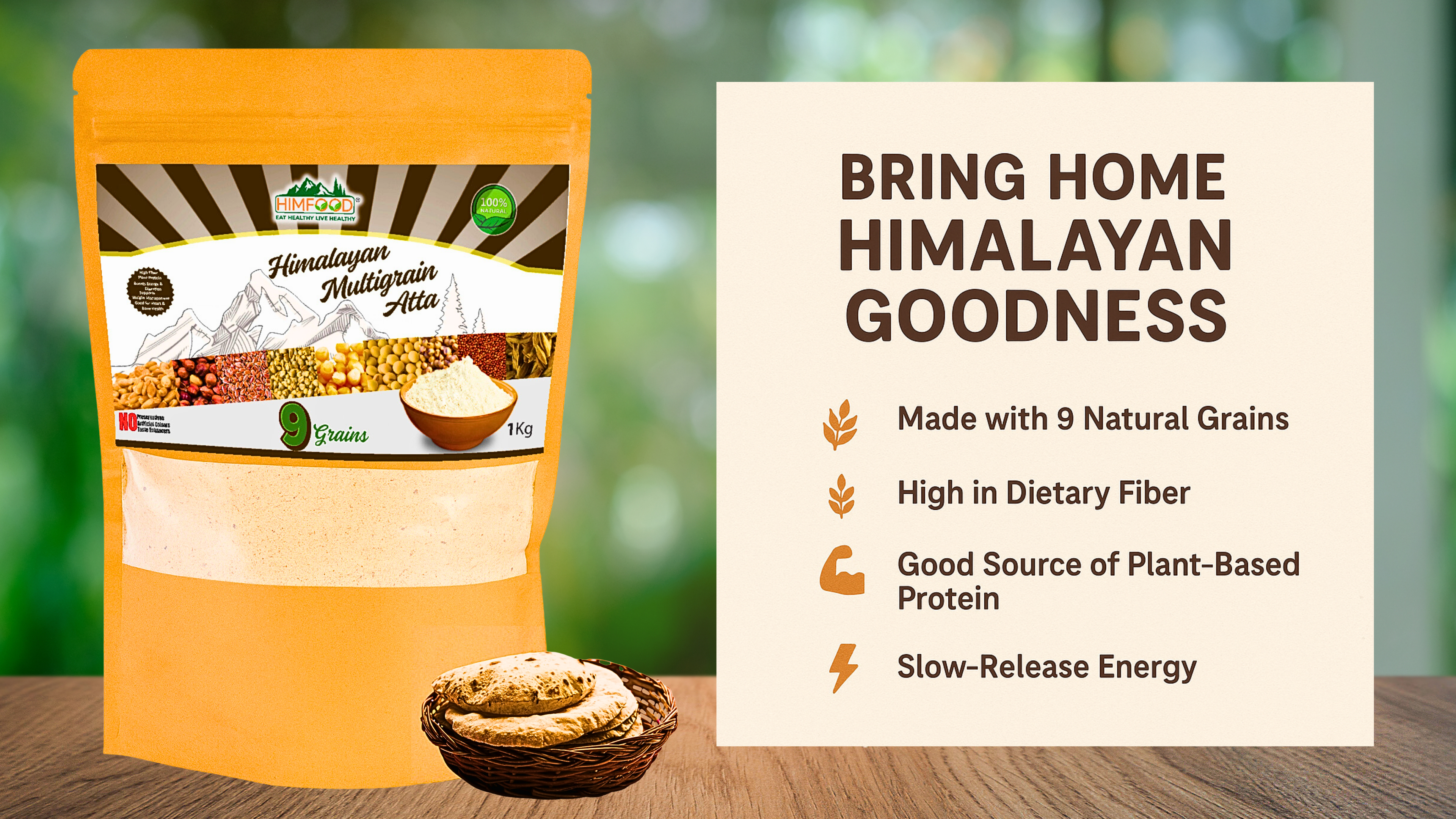 Nutritious Himalayan multigrain atta with wheat, chana, ragi, soybean, bajra, makka, jau, jowar & alsi. High fiber, preservative-free & gut-friendly.