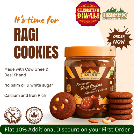 Himalayan Ragi Cookies with Almonds & Cashews – Enjoy the perfect blend of health and taste! Made with nutritious finger millet (ragi/maduwa/Finger millet), rich in calcium and fiber.